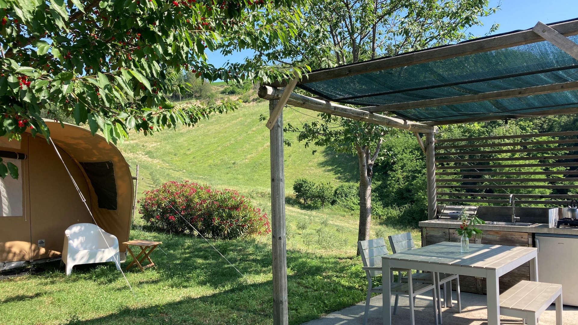 The description of this cottage has not yet been translated. This is the original description: Kleinschalige Agriturismo met zwembad - appartementen & glamping Net buiten het Middeleeuwse dorp Montottone ligt halverwege een heuvel onze gerestaureerde boerenhoeve. Landelijk en zonovergoten, omgeven door wijngaarden, olijfgaarden, zonnebloemen en goudgele graanvelden. We zijn een boerenbedrijf met voornamelijk olijfboomgaarden. Natuur, rust, ruimte en een prachtig uitzicht. In de zomer bieden we onze gasten o.a. comfortabele accommodaties, een fijn ruim zwembad en een gezellige grote buitenlounge. Wij verhuren 3 appartementen en 5 volledig ingerichte Luxe Tenten (Glamping) met privé sanitair en een buitenkeuken. Div. stranden zijn in een half uur bereikbaar, de Sibillini bergen in 45 min. Daartussen is het prachtige en afwisselende landschap van Le Marche geweldig voor mooie tochtjes (per fiets, auto, scooter). Leuke restaurants, de vriendelijke mensen, zomerse feesten en allerlei sportieve mogelijkheden maken het compleet.