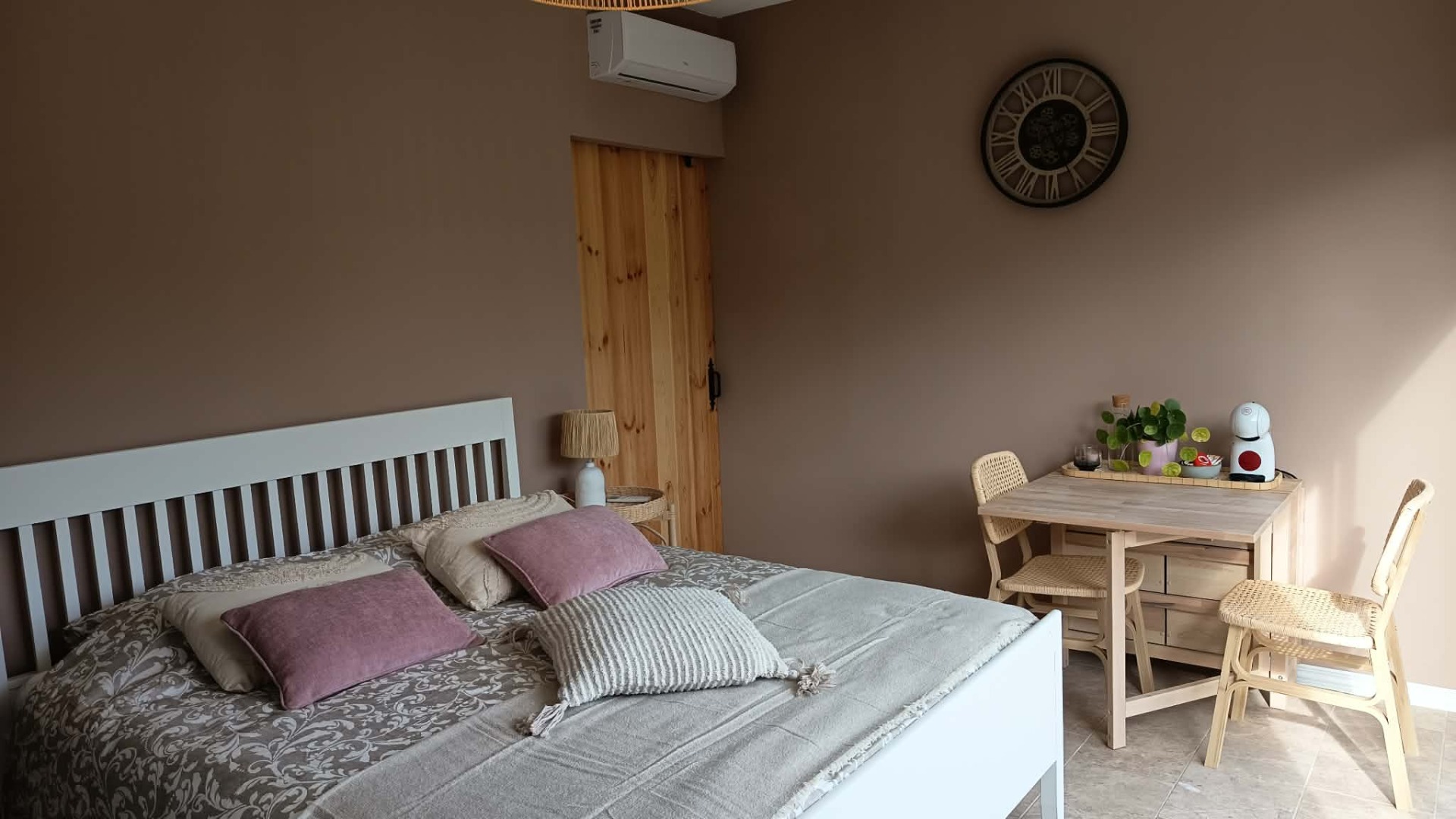 Daarnaast beschikken we over een derde kamer: een comfortabele standaardkamer met een tweepersoonsbed. Deze kamer is ideaal voor vrienden of familie die geen extra voorzieningen nodig hebben. Ze is uitgerust met airconditioning, wifi en een minibar en heeft eveneens een schuifdeur naar het privéterras. Bij binnenkomst is er een inklapbaar tafeltje en een kledingkast met drukdeuren. De badkamer is afgescheiden van de slaapkamer via een schuifdeur en beschikt over een wastafel met opberglades, een toilet en een inloop regendouche.