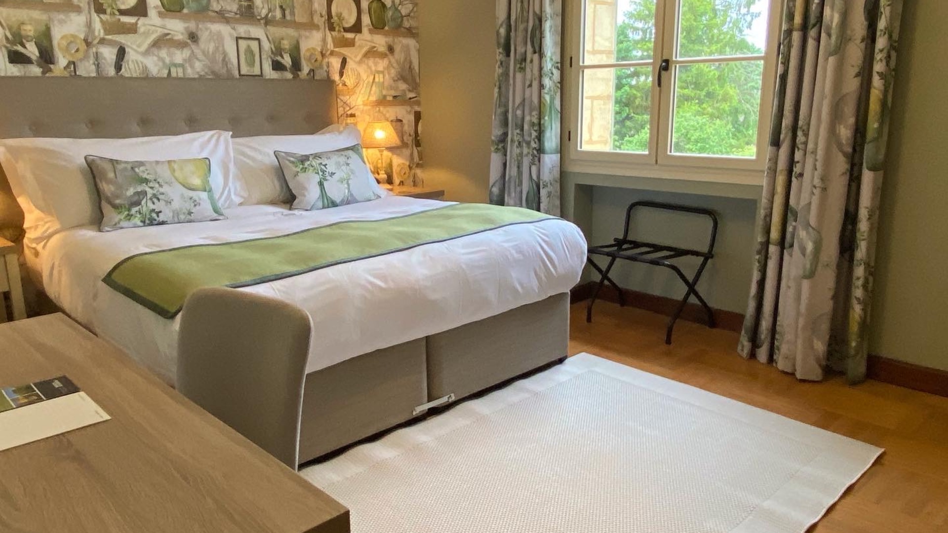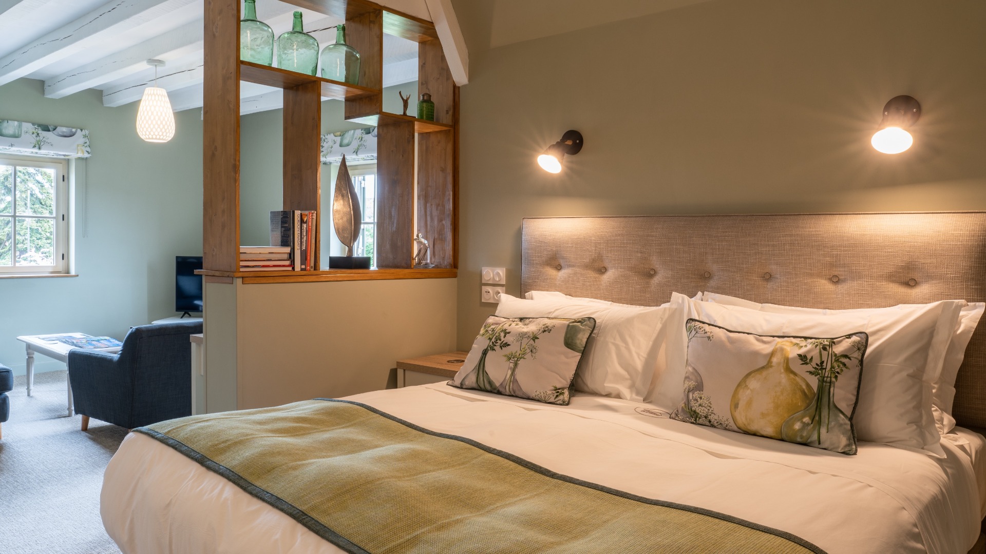 Onze Pigeonnier Suite, gelegen op de tweede verdieping, is een lichte en ruime suite, ideaal voor wie comfort en adembenemende uitzichten zoekt. De aparte lounge, gevestigd in de toren, heeft ramen aan twee zijden, waardoor de ruimte wordt overspoeld met natuurlijk licht en een prachtig panoramisch uitzicht biedt op het omliggende landschap.